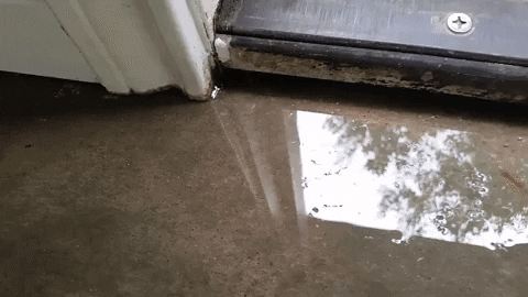 I am standing in the garage looking outward to backyard. Notice the water ripple -it's bubbling out from the below the weather strip. Door frame is dry. From realtor: